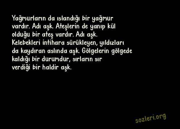 Yağmurların da ıslandığı bir yağmur vardır. Adı aşk. Ateşlerin de yanıp kül olduğu bir ateş vardır. Adı aşk. Kelebekleri intihara sürükleyen, yıldızları da kaydıran aslında aşk. Gölgelerin gölgede kaldığı bir durumdur, sırların sır verdiği bir haldir aşk. ( İlahi Aşk )