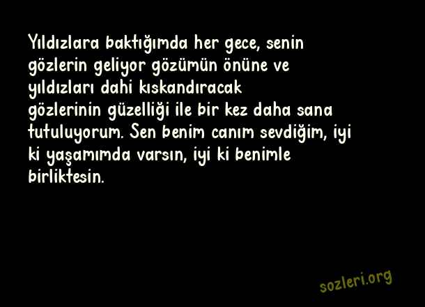 Yıldızlara baktığımda her gece, senin gözlerin geliyor gözümün önüne ve yıldızları dahi kıskandıracak gözlerinin güzelliği ile bir kez daha sana tutuluyorum. Sen benim canım sevdiğim, iyi ki yaşamımda varsın, iyi ki benimle birliktesin. ( Sevgiliye Yazılacak Aşk )