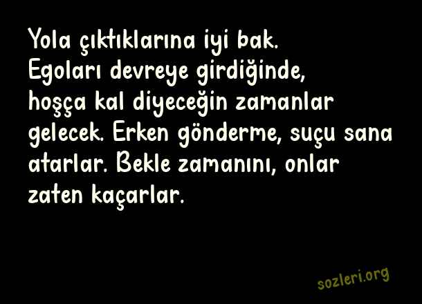Yola çıktıklarına iyi bak. Egoları devreye girdiğinde, hoşça kal diyeceğin zamanlar gelecek. Erken gönderme, suçu sana atarlar. Bekle zamanını, onlar zaten kaçarlar. ( Aşkım Kapışmak )