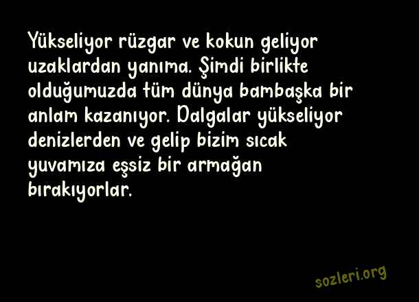Yükseliyor rüzgar ve kokun geliyor uzaklardan yanıma. Şimdi birlikte olduğumuzda tüm dünya bambaşka bir anlam kazanıyor. Dalgalar yükseliyor denizlerden ve gelip bizim sıcak yuvamıza eşsiz bir armağan bırakıyorlar. ( Sevgiliye Yazılacak Aşk )