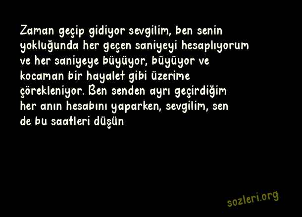 Zaman geçip gidiyor sevgilim, ben senin yokluğunda her geçen saniyeyi hesaplıyorum ve her saniyeye büyüyor, büyüyor ve kocaman bir hayalet gibi üzerime çörekleniyor. Ben senden ayrı geçirdiğim her anın hesabını yaparken, sevgilim, sen de bu saatleri düşün ( Sevgiliye Yazılacak Aşk )