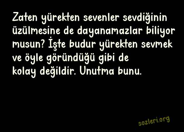 Zaten yürekten sevenler sevdiğinin üzülmesine de dayanamazlar biliyor musun? İşte budur yürekten sevmek ve öyle göründüğü gibi de kolay değildir. Unutma bunu. ( Karşılıksız Aşk )