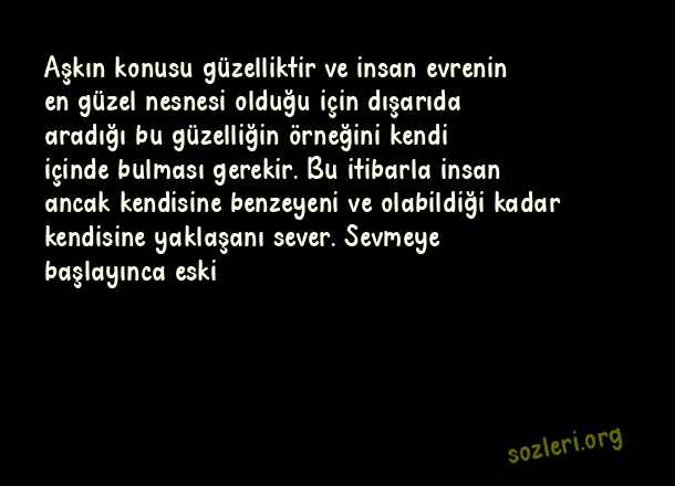 Aşkın konusu güzelliktir ve insan evrenin en güzel nesnesi olduğu için dışarıda aradığı bu güzelliğin örneğini kendi içinde bulması gerekir. Bu itibarla insan ancak kendisine benzeyeni ve olabildiği kadar kendisine yaklaşanı sever. Sevmeye başlayınca eski ( Aşka Dair Sözler )