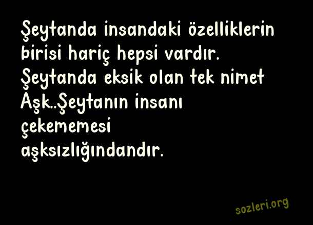 Şeytanda insandaki özelliklerin birisi hariç hepsi vardır. Şeytanda eksik olan tek nimet Aşk..Şeytanın insanı çekememesi aşksızlığındandır. ( Aşka Dair Sözler )