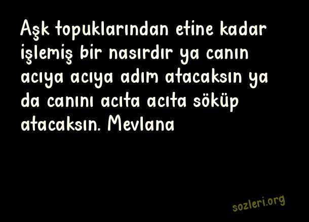 Aşk topuklarından etine kadar işlemiş bir nasırdır ya canın acıya acıya adım atacaksın ya da canını acıta acıta söküp atacaksın. Mevlana ( Aşkı Anlatan Sözler )