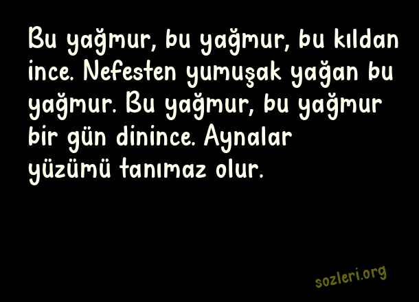 Bu yağmur, bu yağmur, bu kıldan ince. Nefesten yumuşak yağan bu yağmur. Bu yağmur, bu yağmur bir gün dinince. Aynalar yüzümü tanımaz olur. ( Ayna )