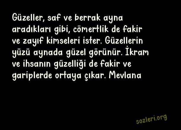 Güzeller, saf ve berrak ayna aradıkları gibi, cömertlik de fakir ve zayıf kimseleri ister. Güzellerin yüzü aynada güzel görünür. İkram ve ihsanın güzelliği de fakir ve gariplerde ortaya çıkar. Mevlana ( Ayna )