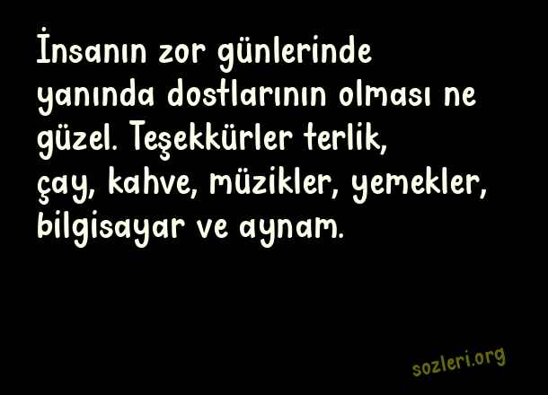 İnsanın zor günlerinde yanında dostlarının olması ne güzel. Teşekkürler terlik, çay, kahve, müzikler, yemekler, bilgisayar ve aynam. ( Ayna )