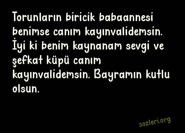 Torunların biricik babaannesi benimse canım kayınvalidemsin. İyi ki benim kaynanam sevgi ve şefkat küpü canım kayınvalidemsin. Bayramın kutlu olsun. ( Kaynanaya Bayram )