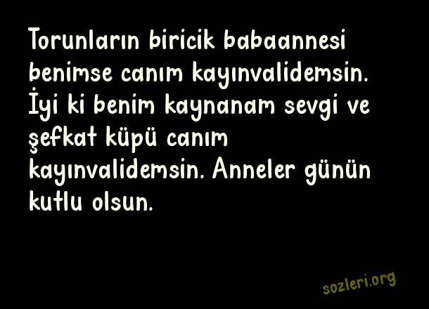 Torunların biricik babaannesi benimse canım kayınvalidemsin. İyi ki benim kaynanam sevgi ve şefkat küpü canım kayınvalidemsin. Anneler günün kutlu olsun. ( Kaynanaya Anneler Günü )