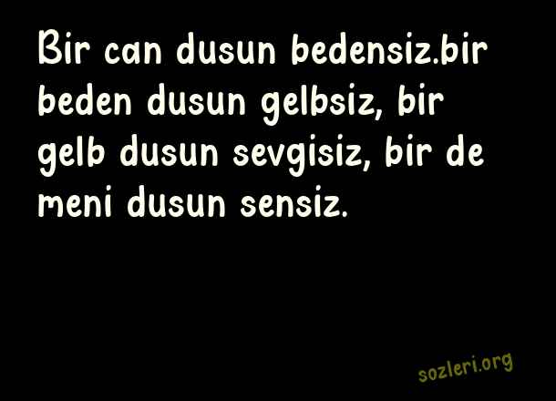 Bir can dusun bedensiz.bir beden dusun gelbsiz, bir gelb dusun sevgisiz, bir de meni dusun sensiz. ( Azerice Aşk )
