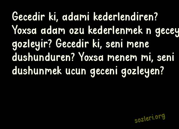 Gecedir ki, adami kederlendiren? Yoxsa adam ozu kederlenmek n geceyi gozleyir? Gecedir ki, seni mene dushunduren? Yoxsa menem mi, seni dushunmek ucun geceni gozleyen? ( Azerice Sevgi )