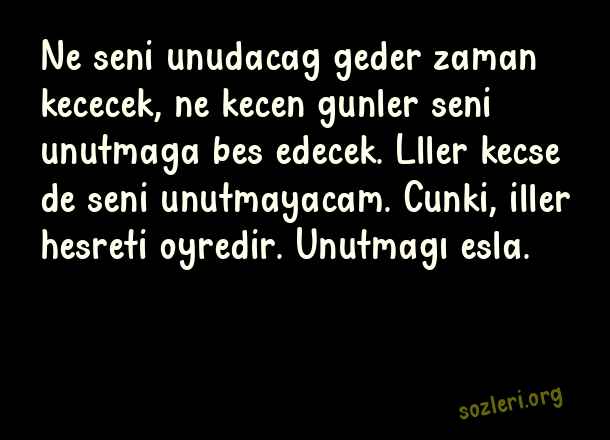 Ne seni unudacag geder zaman kececek, ne kecen gunler seni unutmaga bes edecek. Lller kecse de seni unutmayacam. Cunki, iller hesreti oyredir. Unutmagı esla. ( Azerice Sevgi )
