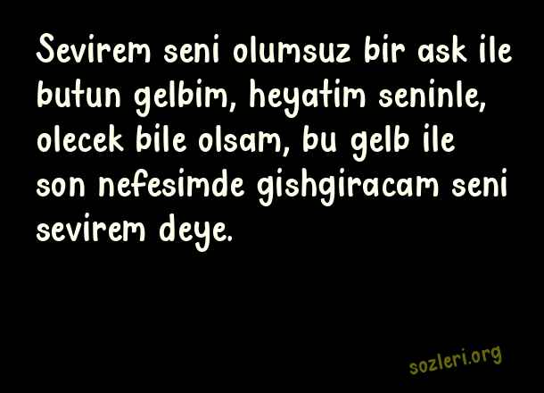 Sevirem seni olumsuz bir ask ile butun gelbim, heyatim seninle, olecek bile olsam, bu gelb ile son nefesimde gishgiracam seni sevirem deye. ( Azerice Sevgi )