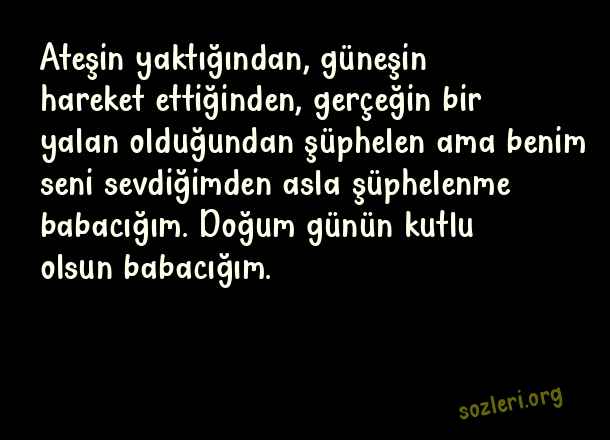 Ateşin yaktığından, güneşin hareket ettiğinden, gerçeğin bir yalan olduğundan şüphelen ama benim seni sevdiğimden asla şüphelenme babacığım. Doğum günün kutlu olsun babacığım. ( Babaya Doğum Günü )