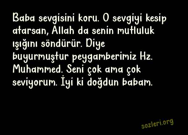 Baba sevgisini koru. O sevgiyi kesip atarsan, Allah da senin mutluluk ışığını söndürür. Diye buyurmuştur peygamberimiz Hz. Muhammed. Seni çok ama çok seviyorum. İyi ki doğdun babam. ( Kızdan Babaya Doğum Günü )