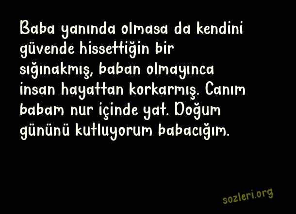 Baba yanında olmasa da kendini güvende hissettiğin bir sığınakmış, baban olmayınca insan hayattan korkarmış. Canım babam nur içinde yat. Doğum gününü kutluyorum babacığım. ( Ölen Babaya Doğum Günü )