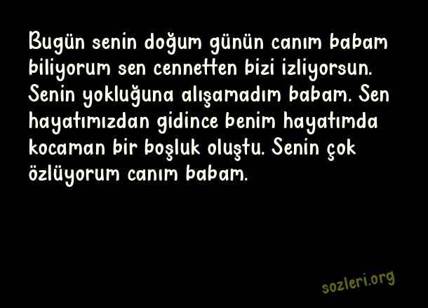 Bugün senin doğum günün canım babam biliyorum sen cennetten bizi izliyorsun. Senin yokluğuna alışamadım babam. Sen hayatımızdan gidince benim hayatımda kocaman bir boşluk oluştu. Senin çok özlüyorum canım babam. ( Ölen Babaya Doğum Günü )