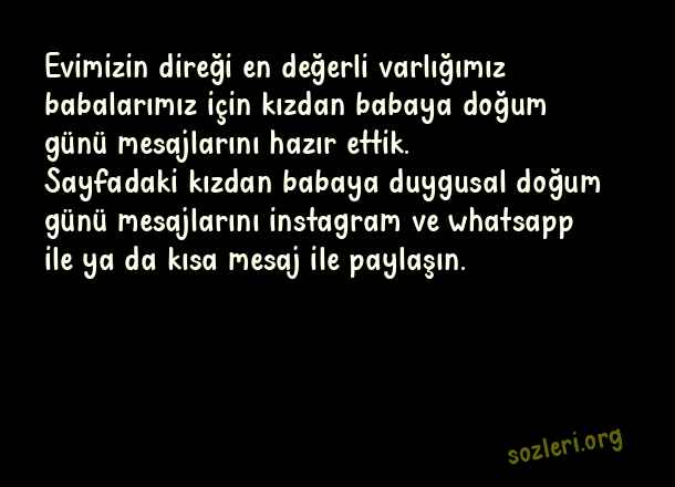 Evimizin direği en değerli varlığımız babalarımız için kızdan babaya doğum günü mesajlarını hazır ettik. Sayfadaki kızdan babaya duygusal doğum günü mesajlarını instagram ve whatsapp ile ya da kısa mesaj ile paylaşın. ( Kızdan Babaya Doğum Günü )