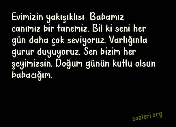 Evimizin yakışıklısı… Babamız canımız bir tanemiz. Bil ki seni her gün daha çok seviyoruz. Varlığınla gurur duyuyoruz. Sen bizim her şeyimizsin. Doğum günün kutlu olsun babacığım. ( Kızdan Babaya Doğum Günü )