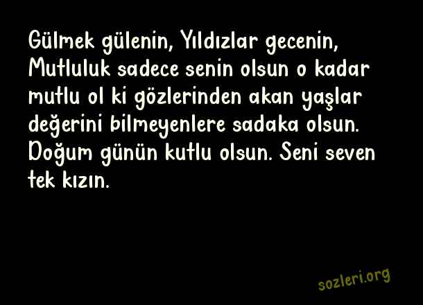Gülmek gülenin, Yıldızlar gecenin, Mutluluk sadece senin olsun o kadar mutlu ol ki gözlerinden akan yaşlar değerini bilmeyenlere sadaka olsun. Doğum günün kutlu olsun. Seni seven tek kızın. ( Kızdan Babaya Doğum Günü )
