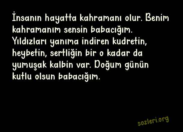 İnsanın hayatta kahramanı olur. Benim kahramanım sensin babacığım. Yıldızları yanıma indiren kudretin, heybetin, sertliğin bir o kadar da yumuşak kalbin var. Doğum günün kutlu olsun babacığım. ( Babaya Doğum Günü )