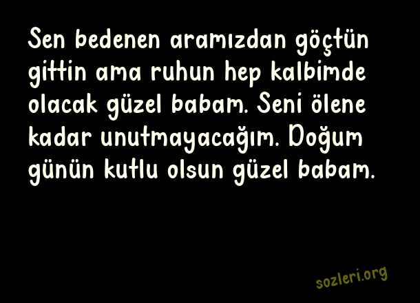 Sen bedenen aramızdan göçtün gittin ama ruhun hep kalbimde olacak güzel babam. Seni ölene kadar unutmayacağım. Doğum günün kutlu olsun güzel babam. ( Ölen Babaya Doğum Günü )