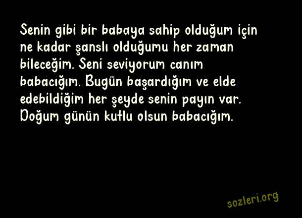 Senin gibi bir babaya sahip olduğum için ne kadar şanslı olduğumu her zaman bileceğim. Seni seviyorum canım babacığım. Bugün başardığım ve elde edebildiğim her şeyde senin payın var. Doğum günün kutlu olsun babacığım. ( Babaya Doğum Günü )