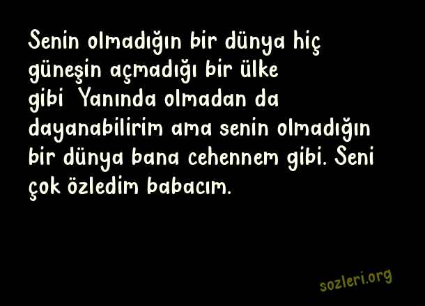 Senin olmadığın bir dünya hiç güneşin açmadığı bir ülke gibi… Yanında olmadan da dayanabilirim ama senin olmadığın bir dünya bana cehennem gibi. Seni çok özledim babacım. ( Ölen Babaya Doğum Günü )