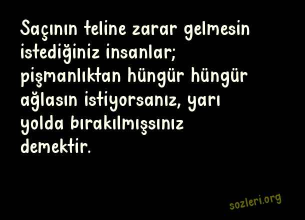 Saçının teline zarar gelmesin istediğiniz insanlar; pişmanlıktan hüngür hüngür ağlasın istiyorsanız, yarı yolda bırakılmışsınız demektir. ( Yarı Yolda Bırakmak )