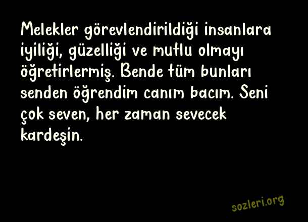 Melekler görevlendirildiği insanlara iyiliği, güzelliği ve mutlu olmayı öğretirlermiş. Bende tüm bunları senden öğrendim canım bacım. Seni çok seven, her zaman sevecek kardeşin. ( Bacıya Güzel Sözler )
