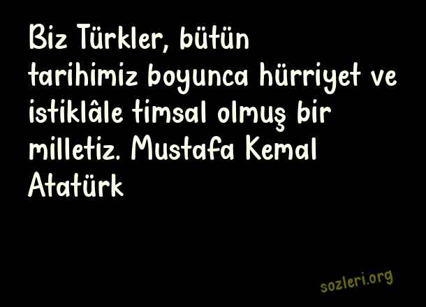 Biz Türkler, bütün tarihimiz boyunca hürriyet ve istiklâle timsal olmuş bir milletiz. Mustafa Kemal Atatürk ( Bağımsızlık )