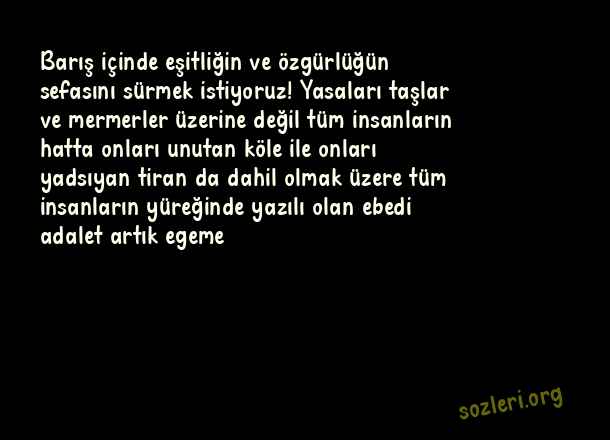 Barış içinde eşitliğin ve özgürlüğün sefasını sürmek istiyoruz! Yasaları taşlar ve mermerler üzerine değil tüm insanların hatta onları unutan köle ile onları yadsıyan tiran da dahil olmak üzere tüm insanların yüreğinde yazılı olan ebedi adalet artık egeme ( Barış )
