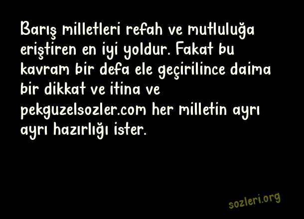 Barış milletleri refah ve mutluluğa eriştiren en iyi yoldur. Fakat bu kavram bir defa ele geçirilince daima bir dikkat ve itina ve her milletin ayrı ayrı hazırlığı ister. ( Barış )