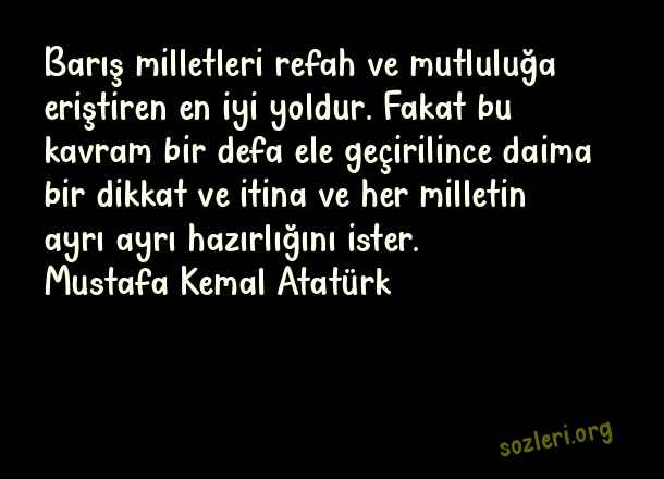 Barış milletleri refah ve mutluluğa eriştiren en iyi yoldur. Fakat bu kavram bir defa ele geçirilince daima bir dikkat ve itina ve her milletin ayrı ayrı hazırlığını ister. Mustafa Kemal Atatürk ( 1 Eylül Dünya Barış Günü )