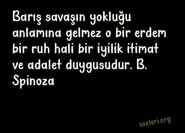 Barış savaşın yokluğu anlamına gelmez o bir erdem bir ruh hali bir iyilik itimat ve adalet duygusudur. B. Spinoza ( Barış )