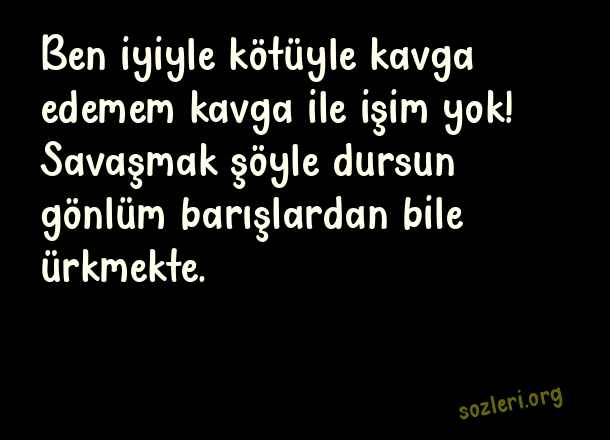 Ben iyiyle kötüyle kavga edemem kavga ile işim yok! Savaşmak şöyle dursun gönlüm barışlardan bile ürkmekte. ( Barış )
