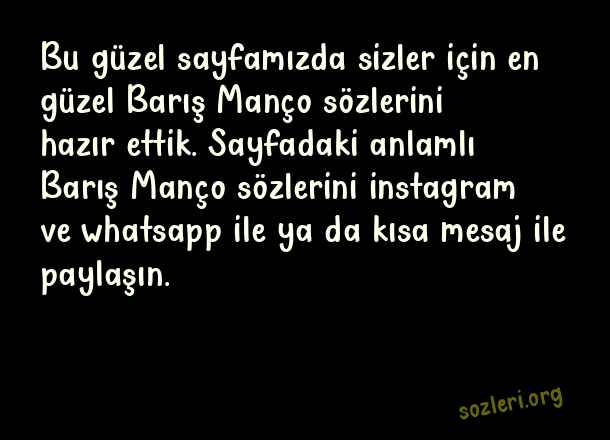 Bu güzel sayfamızda sizler için en güzel Barış Manço sözlerini hazır ettik. Sayfadaki anlamlı Barış Manço sözlerini instagram ve whatsapp ile ya da kısa mesaj ile paylaşın. ( Barış Manço )