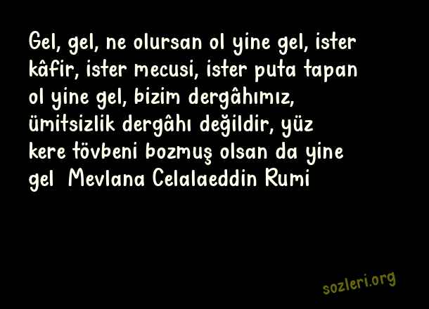 Gel, gel, ne olursan ol yine gel, ister kâfir, ister mecusi, ister puta tapan ol yine gel, bizim dergâhımız, ümitsizlik dergâhı değildir, yüz kere tövbeni bozmuş olsan da yine gel… Mevlana Celalaeddin Rumi ( 1 Eylül Dünya Barış Günü )