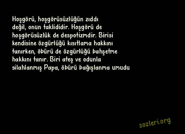 Hoşgörü, hoşgörüsüzlüğün zıddı değil, onun taklididir. Hoşgörü de hoşgörüsüzlük de despotizmdir. Birisi kendisine özgürlüğü kısıtlama hakkını tanırken, öbürü de özgürlüğü bahşetme hakkını tanır. Biri ateş ve odunla silahlanmış Papa, öbürü bağışlanma umudu ( 1 Eylül Dünya Barış Günü )