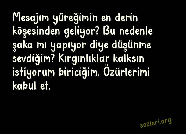 Mesajım yüreğimin en derin köşesinden geliyor? Bu nedenle şaka mı yapıyor diye düşünme sevdiğim? Kırgınlıklar kalksın istiyorum biriciğim. Özürlerimi kabul et. ( Barışma )
