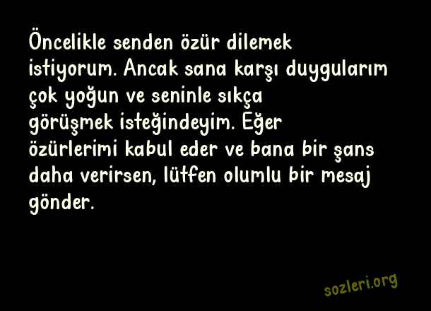 Öncelikle senden özür dilemek istiyorum. Ancak sana karşı duygularım çok yoğun ve seninle sıkça görüşmek isteğindeyim. Eğer özürlerimi kabul eder ve bana bir şans daha verirsen, lütfen olumlu bir mesaj gönder. ( Barışma )