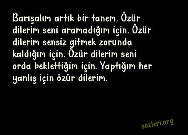 Barışalım artık bir tanem. Özür dilerim seni aramadığım için. Özür dilerim sensiz gitmek zorunda kaldığım için. Özür dilerim seni orda beklettiğim için. Yaptığım her yanlış için özür dilerim. ( Barışma )