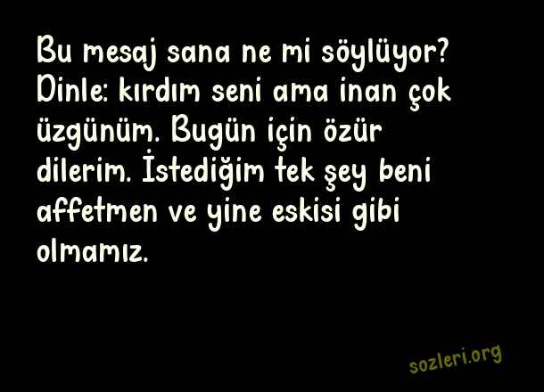 Bu mesaj sana ne mi söylüyor? Dinle: kırdım seni ama inan çok üzgünüm. Bugün için özür dilerim. İstediğim tek şey beni affetmen ve yine eskisi gibi olmamız. ( Barışma )