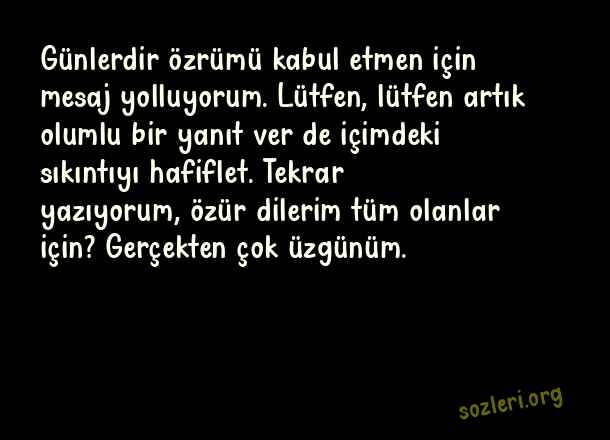 Günlerdir özrümü kabul etmen için mesaj yolluyorum. Lütfen, lütfen artık olumlu bir yanıt ver de içimdeki sıkıntıyı hafiflet. Tekrar yazıyorum, özür dilerim tüm olanlar için? Gerçekten çok üzgünüm. ( Barışma )