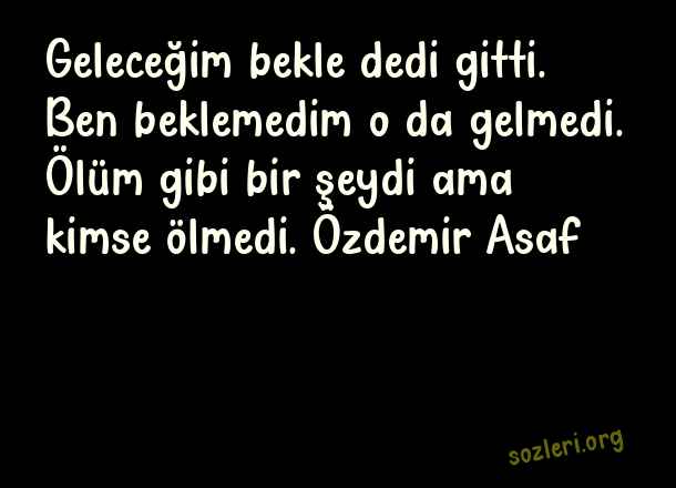 Geleceğim bekle dedi gitti. Ben beklemedim o da gelmedi. Ölüm gibi bir şeydi ama kimse ölmedi. Özdemir Asaf ( Başlamadan Biten Aşk )