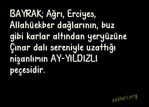 BAYRAK; Ağrı, Erciyes, Allahüekber dağlarının, buz gibi karlar altından yeryüzüne Çınar dalı sereniyle uzattığı nişanlımın AY-YlLDlZLl peçesidir. ( Bayrak Sevgisi )