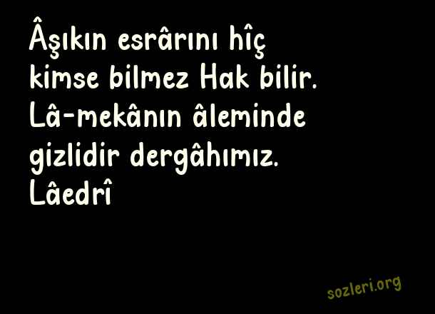 Âşıkın esrârını hîç kimse bilmez Hak bilir. Lâ-mekânın âleminde gizlidir dergâhımız. Lâedrî ( Berceste Beyitler )