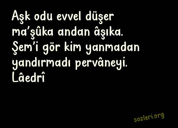 Aşk odu evvel düşer ma’şûka andan âşıka. Şem’i gör kim yanmadan yandırmadı pervâneyi. Lâedrî ( Berceste Beyitler )