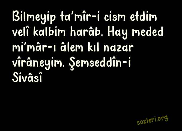 Bilmeyip ta’mîr-i cism etdim velî kalbim harâb. Hay meded mi’mâr-ı âlem kıl nazar vîrâneyim. Şemseddîn-i Sivâsî ( Berceste Beyitler )